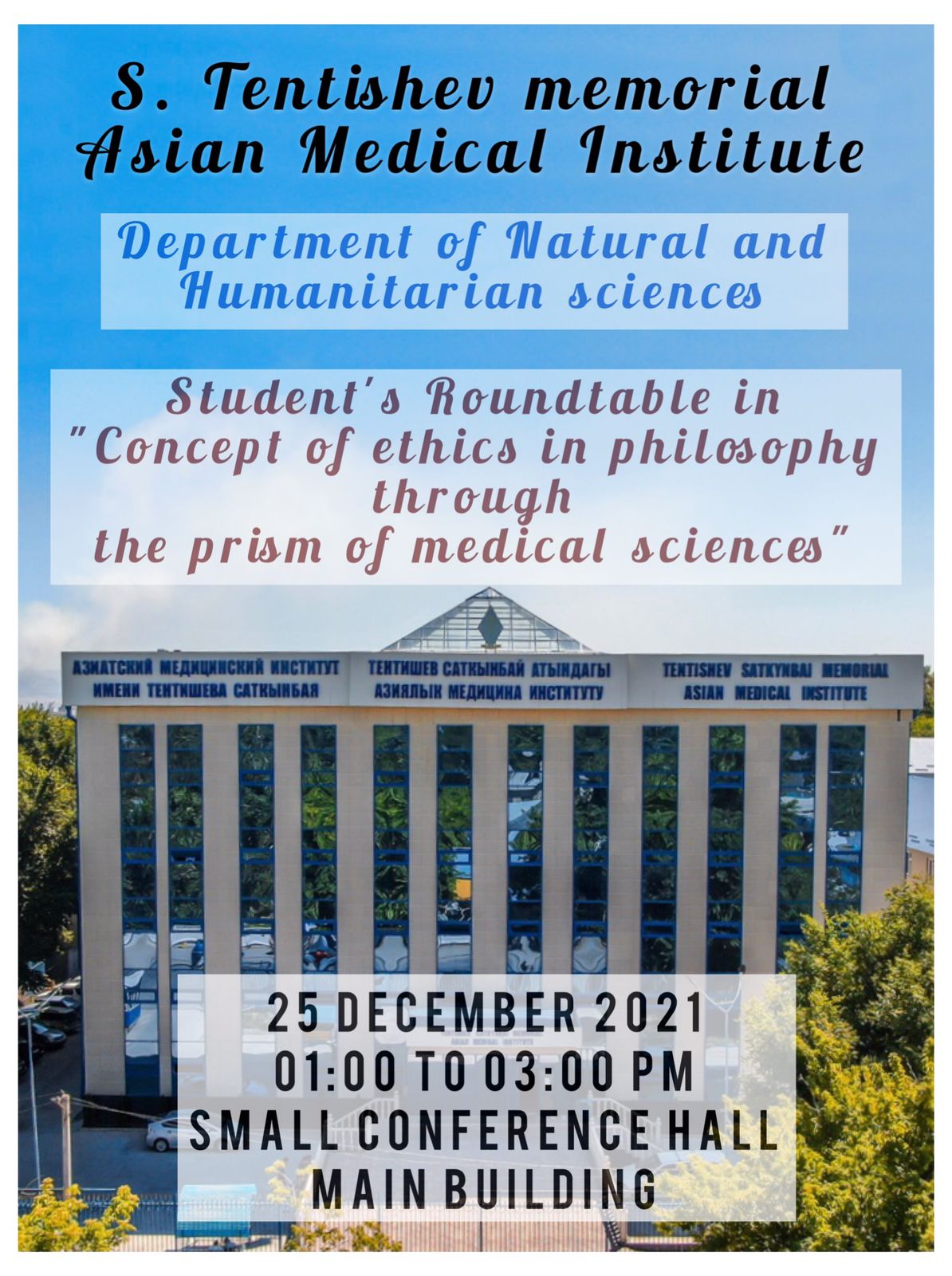 25.12.2021 в АзМИ прошел круглый стол на тему: «Концепции этики в философии через призму медицинских наук». Круглый стол прошел в дискуссионном русле, студенты АзМИ рассматривали этико-деонтолигические вопросы Медицины через призму философии.