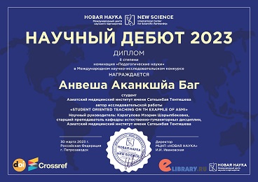 Научно-исследовательская деятельность студентов по праву считается одним из показателей качества образования. Студентка АзМИ им.С.Тентишева факультета Лечебное дело Анвеша Аканкша Баг под руководством научного руководителя ст.преподавателя кафедры естественно-гуманитарных дисциплин Карагуловой М.Ш., участвовала на Международном научно-исследовательском конкурсе ( 30 марта 2023 г.) НАУЧНЫЙ ДЕБЮТ 2023, и ее статья «Студентоориентированное обучение на примере АзМИ» была удостоена диплома II степени в номинации «Педагогические науки» и опубликована в сборнике статей конкурса. Желаем Аканкшйе успехов в учебе и в ее научных начинаниях.