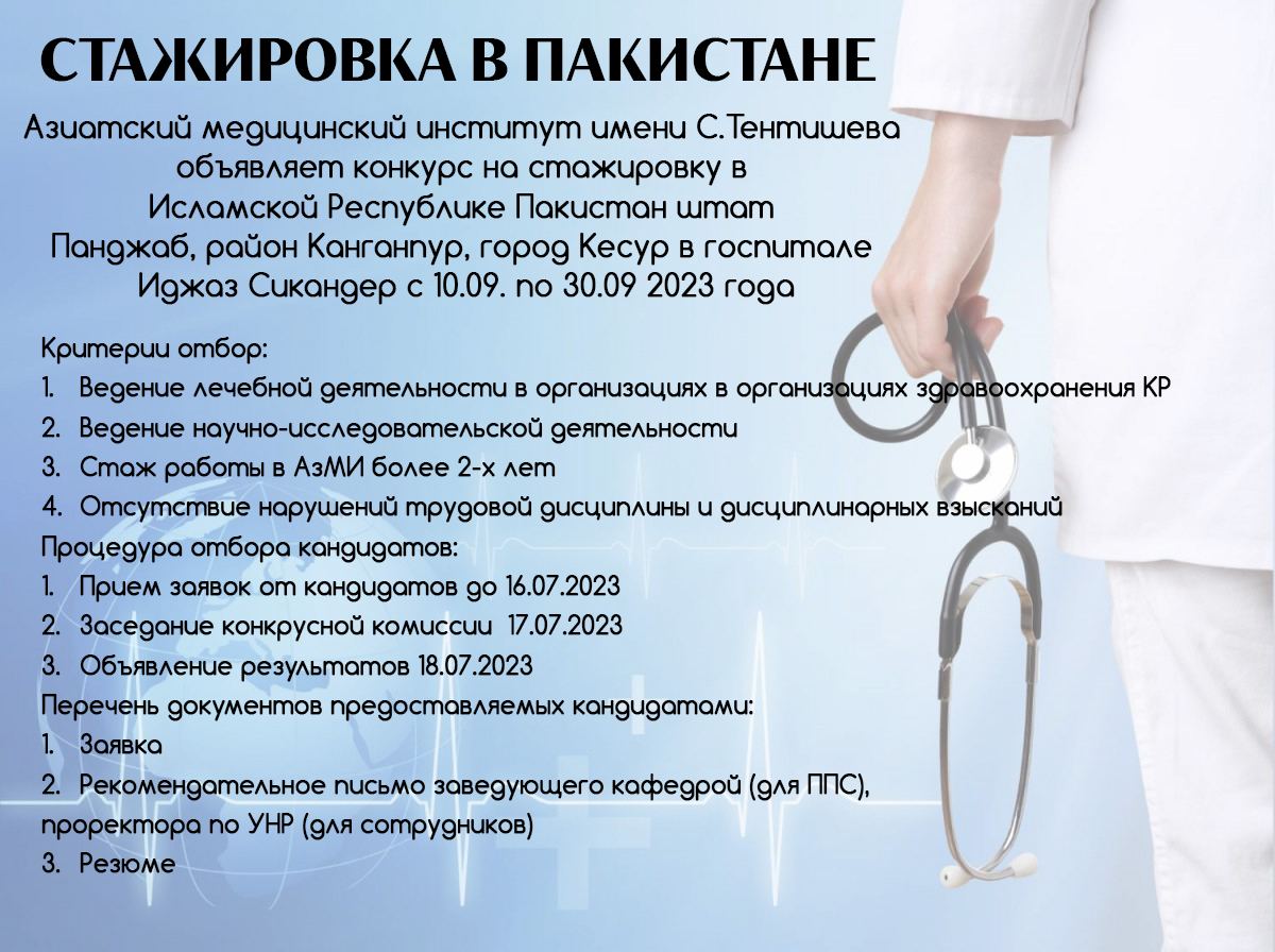 Азиатский медицинский институт имени С.Тентишева объявляет конкурс на стажировку в Исламской Республике Пакистан штат Панджаб, район Канганпур, город Кесур в госпитале Иджаз Сикандер с 10.09.по 30.09 2023 года