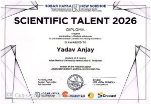 Кафедра продолжает активно развивать научно-исследовательскую деятельность студентов в соответствии с миссией университета, направленной на подготовку высококвалифицированных, конкурентоспособных и социально ответственных специалистов, способных эффективно действовать в условиях глобальных трансформаций и интеграции науки, образования и практики. В марте 2026 года результаты данной системной работы получили высокую оценку на международном уровне — опубликованы научные статьи, удостоенные дипломов I степени. «Железодефицитная анемия у детей» Научный руководитель: Абдукадырова Х.М. Студент: Ядав Санжай (6 курс) Научная работа посвящена одной из наиболее актуальных проблем педиатрии — железодефицитной анемии у детей. В исследовании представлены современные данные о патогенезе, факторах риска, клинических проявлениях, а также обоснованы подходы к диагностике и лечению с позиций доказательной медицины. Работа удостоена диплома I степени в номинации «Медицинские науки». Международный научно-исследовательский конкурс, г. Петрозаводск МЦНП «Новая наука» 18 марта 2026 г.