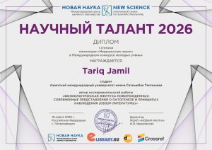 «Физиологическая желтуха новорождённых: современные представления о патогенезе и принципах наблюдения». Работа отражает современные научные подходы к изучению физиологической желтухи новорождённых, включая механизмы гипербилирубинемии, особенности постнатальной адаптации, а также принципы наблюдения и дифференциальной диагностики.Научный руководитель: Сулайманова Э.Дж. Студент: Тарик Жамил . Работа удостоена диплома I степени 18 марта 2026 г.