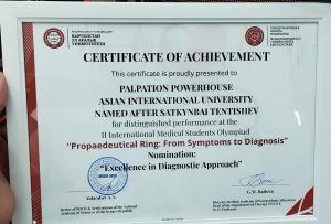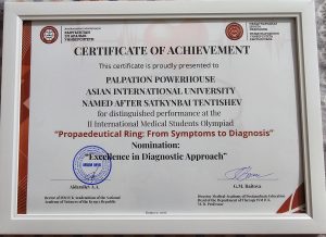 На II Международной олимпиаде студентов медицинских вузов «Пропедевтический ринг: От симптомов к диагнозу» («Propaedeutical ring: From Symptoms to Diagnosis») команда АзМУ Им.С.Тентишева заняла призовое место. В Международном университете Кыргызстана завершилась состоялось мероприятие, которое проходило в рамках V Юбилейной международной научно-практической конференции «ИННОВАЦИИ В ЗДРАВООХРАНЕНИИ: ИНТЕГРАЦИЯ МЕДИЦИНСКОЙ ПРАКТИКИ, НАУКИ И ОБРАЗОВАНИЯ». В олимпиаде участвовали команды из 14 вузов из Кыргызстана, Казахстана и Узбекистана.